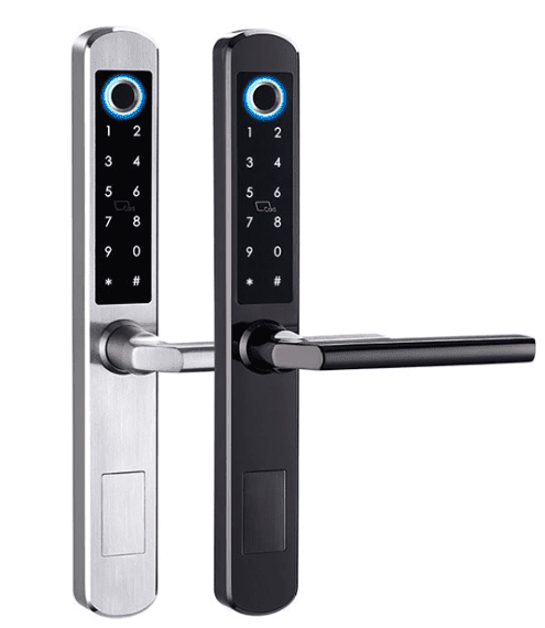 WeźSlim inteligentny zamek do drzwi z czytnikiem linii papilarnych — FM 210 jako przykład. Ten produkt obsługuje kontrolę za pośrednictwem aplikacji TUYA / TT Lock, z metodami odblokowywania, w tym biometrycznym odciskiem palca, kodem, NFC, identyfikatorem RF i kluczami mechanicznymi.